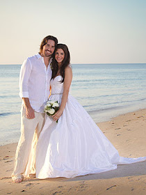 The bride, 22, wore an Amsale gown and veil and the groom was casual in a white linen Armani shirt and Tommy Bahama drawstring pants – though both were barefoot on the beach as the sun rose over the ocean.